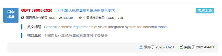 2020年9月29日,由巨能機器人參與編制的國家標(biāo)準(zhǔn)《工業(yè)機器人視覺集成系統(tǒng)通用技術(shù)要求》獲批正式發(fā)布,標(biāo)準(zhǔn)編號為GB/T 39005-2020,該標(biāo)準(zhǔn)將于2021年4月1日起正式實施。