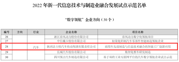 日前,工業(yè)和信息化部發(fā)布了《關(guān)于2022年新一代信息技術(shù)與制造業(yè)融合發(fā)展試點(diǎn)示范名單的公示》。法士特集團(tuán)申報(bào)項(xiàng)目“商用車先進(jìn)制造與信息技術(shù)融合的智能工廠創(chuàng)新應(yīng)用”成功入選“數(shù)字領(lǐng)航”企業(yè)方向試點(diǎn)示范名單。