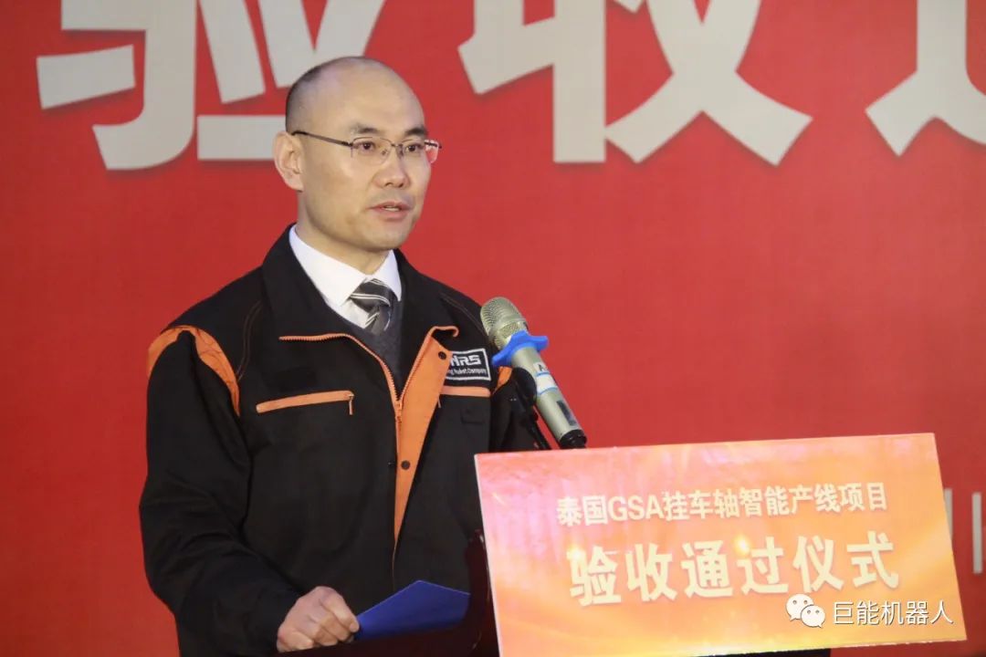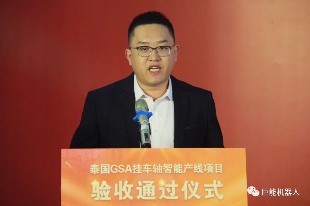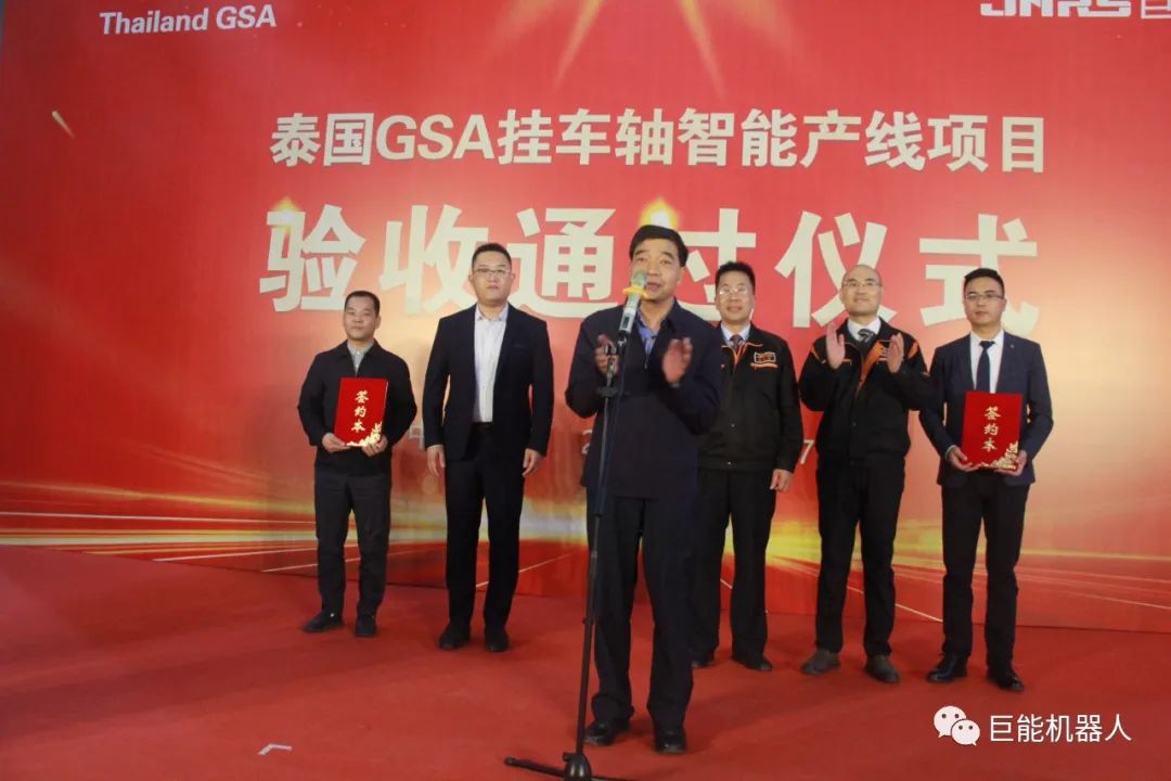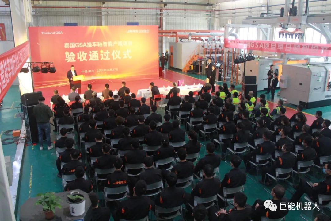 4月27日上午,“泰國(guó)GSA掛車(chē)軸智能產(chǎn)線(xiàn)項(xiàng)目驗(yàn)收通過(guò)儀式”在巨能公司舉行,銀川經(jīng)開(kāi)區(qū)黨工委委員、管委會(huì)副主任樊斌宣布項(xiàng)目正式開(kāi)機(jī)自動(dòng)運(yùn)行,泰國(guó)GSA項(xiàng)目管理團(tuán)隊(duì)、產(chǎn)線(xiàn)供應(yīng)商伙伴、媒體記者和巨能公司員工共同出席見(jiàn)證。