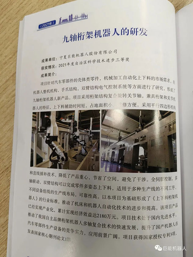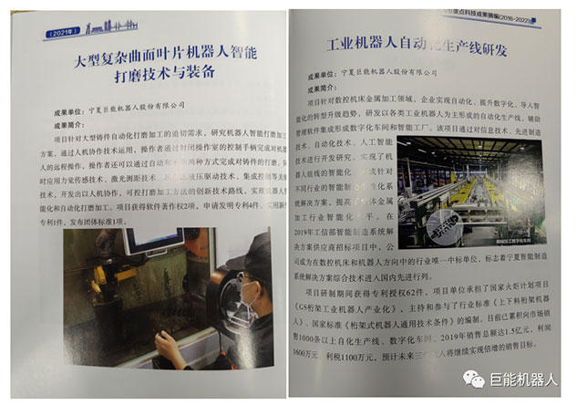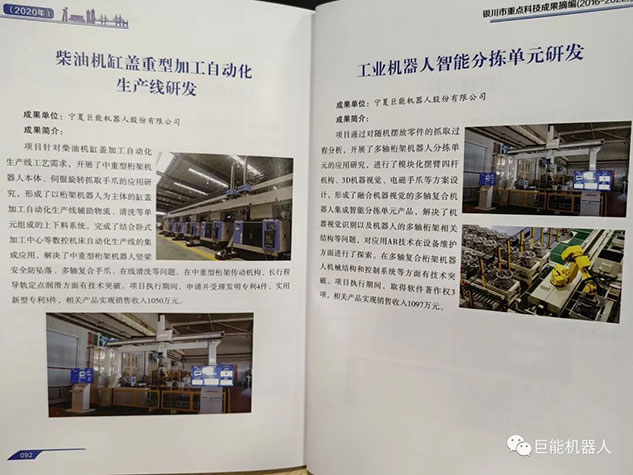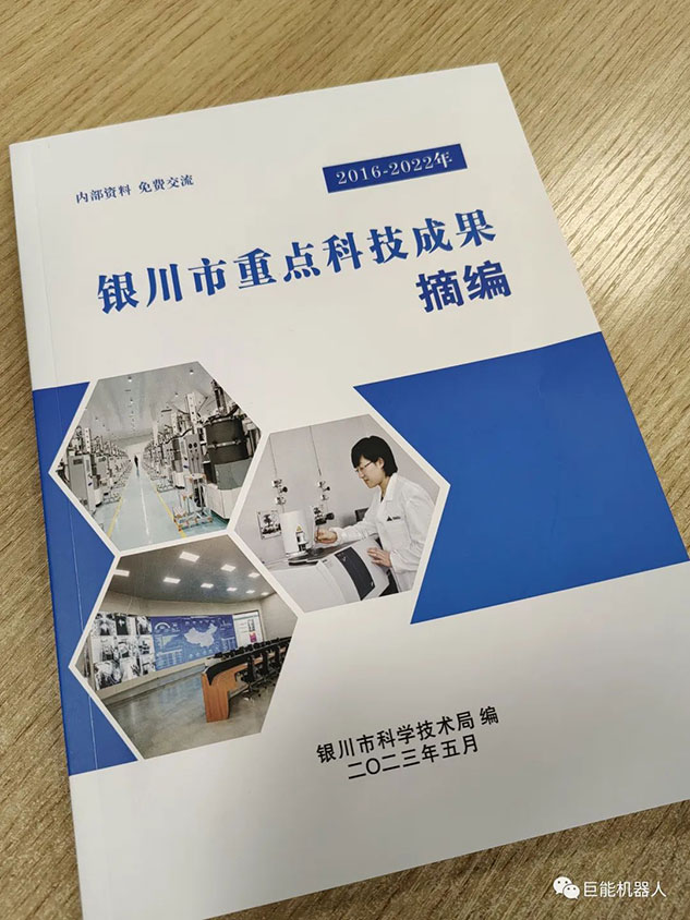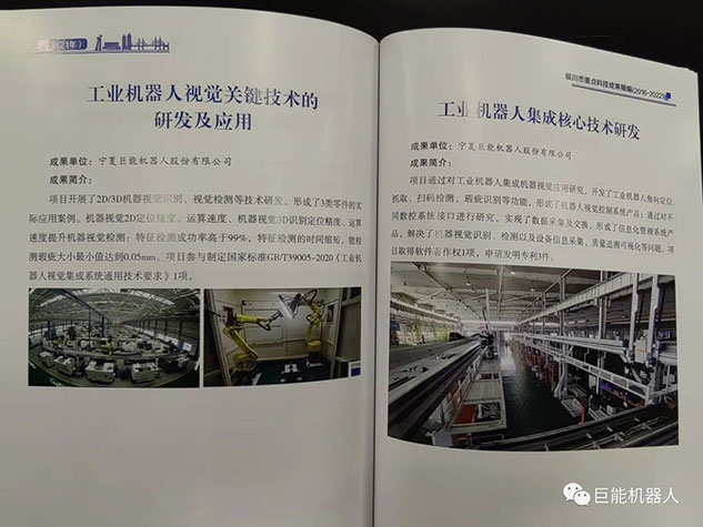 在《銀川市重點科技成果摘編(2016-2022年)》中,巨能機器人公司的《工業(yè)機器人自動化生產線研發(fā)項目》、《大型復雜曲面葉片機器人智能打磨技術與裝備》、《工業(yè)機器人視覺關鍵技術的研發(fā)與應用》、《工業(yè)機器人集成核心技術研發(fā)》、《柴油機缸蓋重型加工自動化產線研發(fā)》、《工業(yè)機器人智能分揀單元研發(fā)》等多項科技成果被收錄其中。